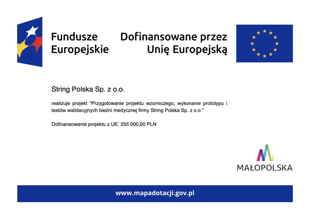 Firma String Polska Sp. z o.o. uzyskała dotację z Unii Europejskiej na projekt „Przygotowanie projektu wzorniczego, wykonanie prototypu i testów walidacyjnych bieżni medycznej firmy String Polska Sp. z o.o.”